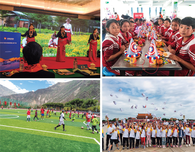 图1-4:2020德钦县梅里雪山推介会;「星旅家庭成长计划」公益项目,为孩子们打造学习生活空间;集团帮扶的德钦三小操场;中国旅游集团希望之星成长营