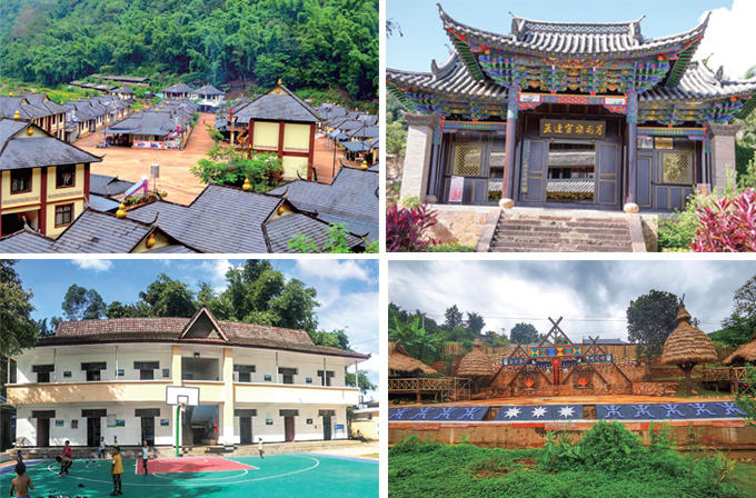 图1-4:娜允镇贺雅小组民族特色村寨照片;孟连宣扶司署;富岩镇大曼糯小学新建宿舍楼;孟连芒信镇拉嘎村永前老寨乡村旅游建设项目
