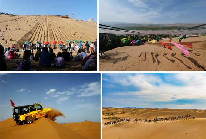 这里有中国最大的天然滑沙场——“沙坡鸣钟”;有总长820米,横跨黄河的“天下黄河第一索”——沙坡头黄河滑索;有黄河文化的代表-----古老水车;世界第一条成功横穿沙漠的铁路-----包兰铁路;还有黄河上最古老的交通工具-----羊皮筏子;可以骑骆驼遨游沙海,徒步或自驾穿越腾格里沙漠到达沙漠中的伊甸园------通湖草原,体验挑战生命禁区的快意感觉;乘坐沙海冲浪车,咫尺之间领略大漠孤烟,长河落日的奇观。
