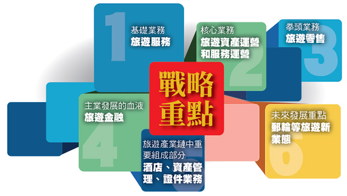 其次要突出战略重点,这个很重要,只有让上下清晰了战略重点,才能使集团未来发展更加清晰有序。集团年会提出,旅行服务是基础业务,必须坚定不移做强做优做大旅行服务,但要加大转型升级力度。旅游资产经营和服务运营是核心业务,要深入推进休闲度假目的地、景区和旅游地产的一体化运作,打造若干个具有真正市场影响力的项目,持续提升市场影响力。旅游零售是拳头业务,是独特竞争优势和重要利润贡献来源,必须在做强并延伸旅游零售业务的基础上,加大对旅游全产业链的带动力。旅游金融是旅游主业发展的血液,必须在防控风险的基础上深入推进产融结合、服务旅游主业。酒店、资产管理、证件业务是旅游产业链中的重要组成部分,要继续做强做优,为集团旅游主业提供好支持。邮轮等旅游新业态是适应消费需求变化的新供给,是未来发展的重点,要有计划加大投入和培育力度。这些亮点值得我们关注。
