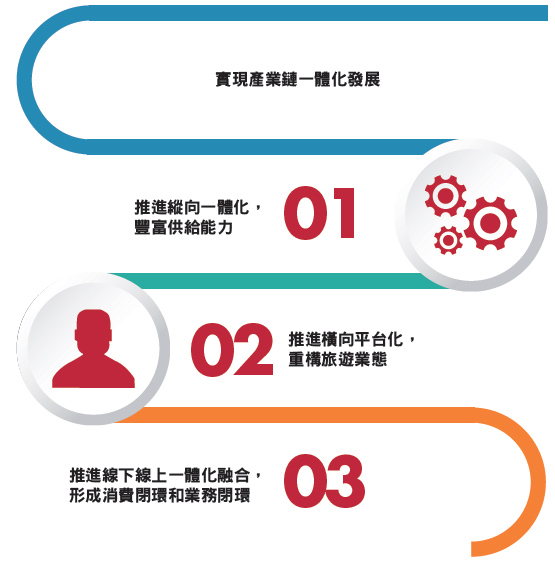 实行产业链一体化发展,重点要抓好三个方面。要推进纵向一体化,丰富供给能力。要推进横向平台化,重构旅游生态。要推进线上线下一体化的融合,形成消费闭环和业务闭环。集团年会讲「产业链一体化发展」是很重要的,事实上,游客对吃住行游娱购等的需求是综合性的、一体化的,这就要求进一步整合旅游要素,进一步完善旅游产业结构、产品结构和产业链条。