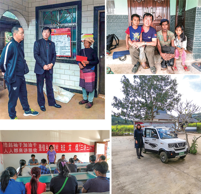 图:挂职干部王文魁(中)入户发放救急难救助资金;王文魁访建档立卡贫困户时,与留守老人儿童在一起;挂职干部王玮在景信乡回俄村开展脱贫攻坚工作;驻村干部王玮为方便工作,自买了一轮新能源车作交通工具