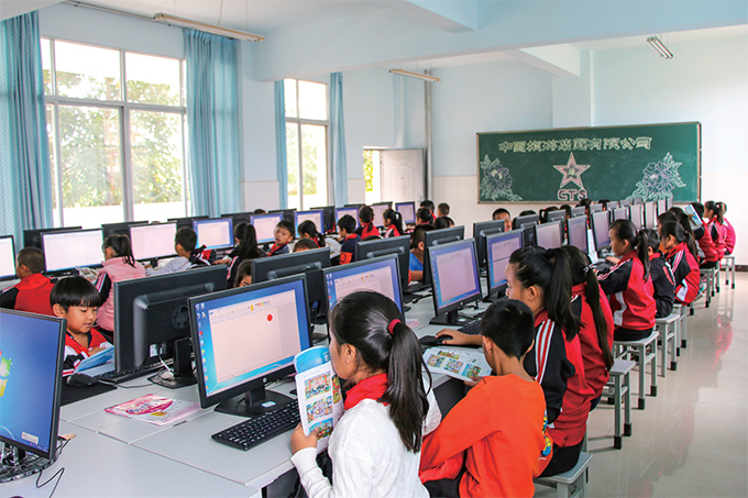 扶贫先扶智,教育先行。图为集团实施的基层中小学电脑教室项目,黑板上是孩子们手绘的集团logo