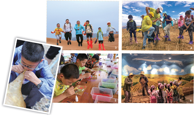 向沙漠进军;孩子们实践麦草方格;孩子们喜欢D I Y平面沙画;研究导师给孩子们讲解麦草方格;小朋友使劲吹羊皮筏子