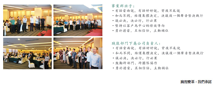 本次研讨会是事业群重组整合後,明确共同目标、统一战略思想、整齐管理行为的开篇,是干部个人领导力发现与认知的启航;我们承诺:和而不同,维护集体决定;我们勇於担当,互相信任,拥抱变革。正如事业群总经理蒋洪在结课总结时说的那样:「从改变自己开始,改变自己的领导风格,提升自己领导能力,从而改变团队,改变我们在行业中的位置。我们不求一步就让你的评估报告都变成绿色,我们重在一步一步的改善, 一步一步的提升,我相信我们有共同的愿景,有明确的共同尺度,有共同的价值观,一定能实现共同的目标。」