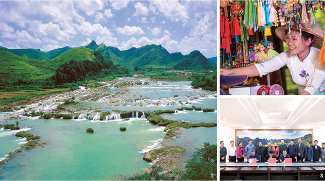 图1-3:叠瀑荡漾下的瑰丽水色、边境集市上的越南姑娘正在卖些手工品、三方签署合作协议的场景