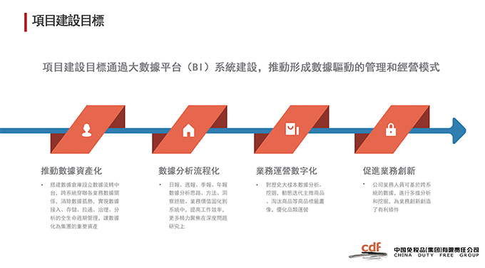 2018年6月中旬,中免集团启动大数据平台(BI) 分析系统一期建设,当年12月底正式上线,2019年1月进入试运行期,目前系统运行稳定。一期系统建设主要完成了以下重点任务,一是推进数据整合,跨系统串联各业务数据,让数据成为集团重要资产;二是定制业务模型,为采购补货、品牌汰换提供运营决策支撑;三是定制开发常规报表和自定义报表,提升业务部门工作效率;四是专题攻关,首次跨系统拉通商品流转过程,真实反映商品全链条毛利率。