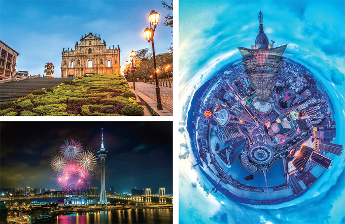 图:澳门大三巴牌坊(文字作者提供);澳门夜景(裴定安提供);澳门全景(裴定安 摄)