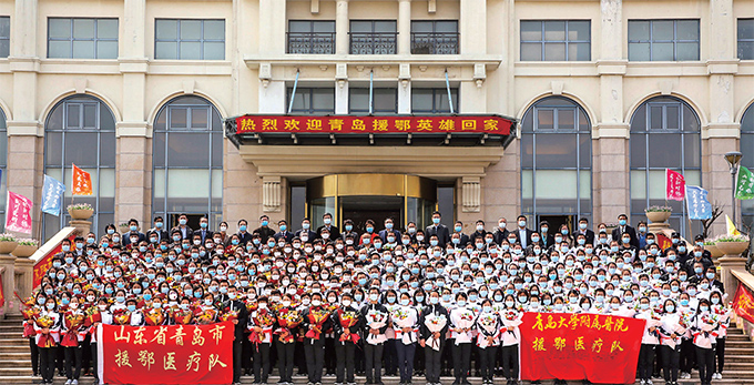青大附院特意送来了一封特别的感谢信:「感谢你们在隔离期间为青岛大学附属医院援鄂医疗队所做的辛苦付出,为我们隔离期间的安全保驾护航,让我们平稳度过隔离期,平安返家!」信上,143名青大附院的援鄂医护人员用红手印,组合成了「青大附院」四个大字。
