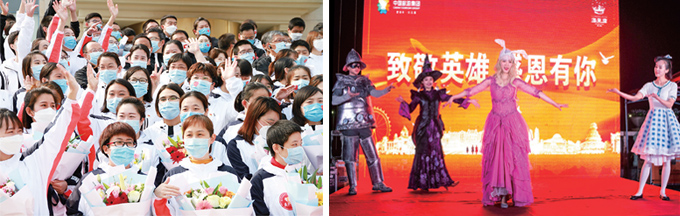 青岛海泉湾还建了专门的微信群,每天关注医护人员的心理状态及需求,经常与医护人员互动;特意安排天创大剧院的专业演员教医护人员跳轻松欢快的网红舞蹈;细心地为医护人员过生日,送上惊喜与祝福;医护人员临别之际, 还精心策划了「致敬英雄·感恩有你」的主题歌舞晚会。