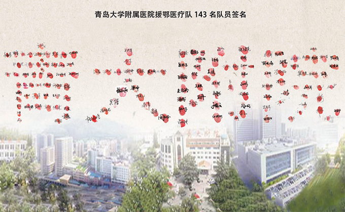 143名援鄂医护人员用红手印,组合成「青大附院」,表示感谢