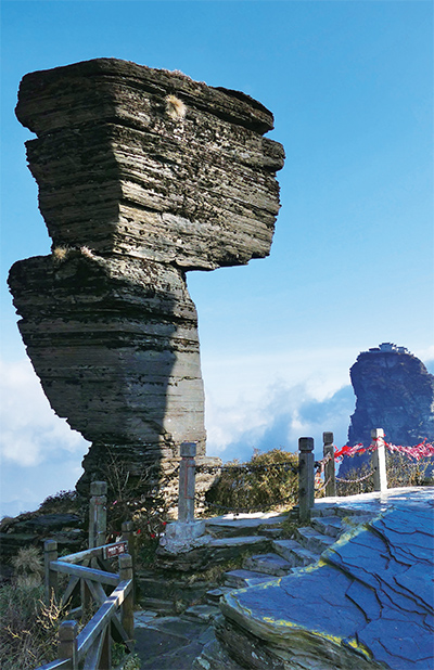 山风逐渐大了起来,我们继续攀爬,刚刚爬上山脊还没来得及站稳脚跟,呼啸肆虐的刺骨山风劈头盖脸地就刮了过来,着实让人猝不及防,旁边两位先生的帽子瞬间吹落在地,不知是谁的一条围巾被狂风吹向了远方。好家伙!难怪朋友们坚持要给我买件外套穿。我一手护住帽子,一手端起相机选取镜头,一会儿手就冻僵了。从山下到山顶气温的骤然变化,正是这梵净山气候垂直分布「一山四季」的特徵。寒风并没有吹动我们的信念,依然顶风守候在那里,看着那呼啸的山风渐渐吹开云雾露出了金顶,令人叫绝。一路上压在心头的阴霾终於吹散了。我们坚持下来了,「黔山第一」、「天下众名岳之宗」的真面目我们见到了。我要好好看看这山、这云和这登天之路!此刻,我极目远眺,天穹尽览。右边的老金顶巍峨高耸云端,左边的新金顶与之隔空相望云海相连。蘑菇石、老鹰岩、万卷书、太子石等奇峰异石峭拔山脊、形态各异,处处奇妙!造物主真是神奇伟大,创造出这麽奇伟的景色!站在云端上,我们仿佛来到了天界,正在与天公对话。