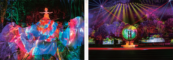 当夜幕降临,游客有序检票後,乘坐景区观光车穿越中越边境道路,来到德天牌坊前,蛙神跳着精彩的蚂拐舞迎接游客们的到来,开始进入『奇妙·夜德天』美妙新篇章;所有游客在流光溢彩的光影中,参与动感互动,启动奇妙的盗梦空间;来到壮家干栏式小楼前参与抛绣球竞技互动体验,见证阿哥阿妹的爱情故事发展动线;随後沿着花神秘径探寻花神寓所,通过击铜鼓互动为蛙神拯救苍生而助力;最後在族长的带领下参与蚂拐祭祀求雨仪式⋯⋯