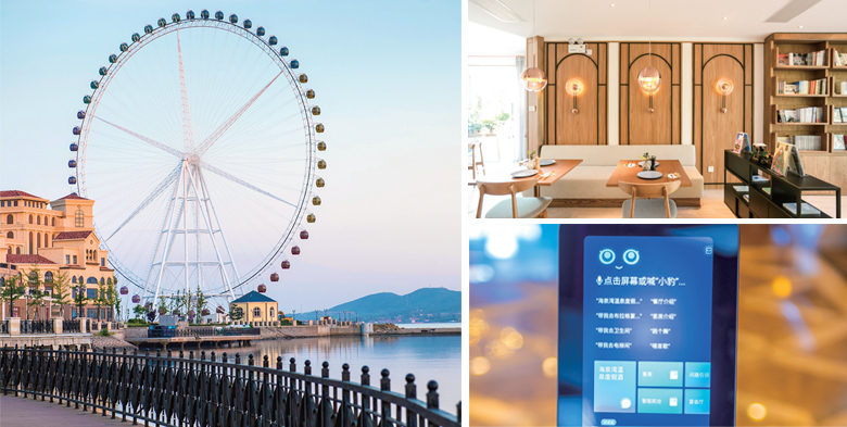 图1-3:海洋之星摩天轮;珠海海泉湾时光序的烹饪图书馆一角;咸阳海泉湾智能机器人小湾