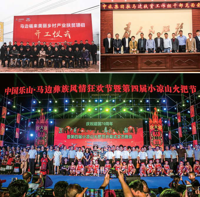 集团驻马边扶贫工作组见面会合影;集团与马边县政府联合主办小凉山火把节