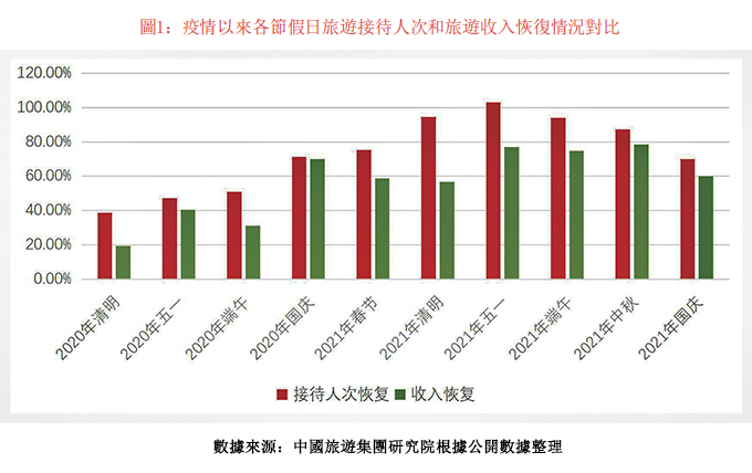 国内旅游呈现先高後低、跌宕起伏的复苏特徵。受益於疫情的有效控制,国内旅游在全球率先复苏,但2021年下半年以来,受疫情多点散发、跨省游熔断「常态化」等影响,复苏速度有所减慢。根据中国旅游研究院最新预测数据,2021年国内旅游接待人数恢复到2019 年的57%,国内旅游收入恢复到2019年的53%,显着低於其对2021年上半年的预测数据。中国旅游研究院此前预测数据显示,2021上半年国内旅游接待人次恢复到疫情前的7成左右。节假日出行市场先行复苏。2021年春节、清明、五一、十一等节假日国内旅游人数分别恢复到疫情前同期的75.3%、94.5%、103.2%和70.1%,国内旅游收入恢复到疫情前同期的58.6%、56.7%、77.0%和59.9%,好於年度恢复情况。主要客源地恢复优於主要目的地。靠近主要客源市场的旅游景区客流增长趋势明显,而面向中远端旅游市场的自然资源和历史文化资源型旅游景区接待人次和综合旅游收入下降明显。中国旅游研究院专项调查数据显示,游客目的地平均游憩半径从2020年的14.2公里收缩到2021年的13.1公里。