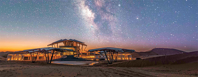 沙漠星星酒店,是度假区为了让游客能够更深度的感受大漠星空的魅力,实现与星空对话的梦想而精心打造的特色产品。酒店以沙漠、星空、禅意为主要的设计项目,从高空俯瞰,犹如巨大的五角星镶嵌在大漠之中。白天, 斑驳的雪迹点缀在腾格里沙漠,在瑞雪覆盖的星星酒店纯洁而优雅;夜晚,北纬37度、海拔1430米的地理条件使得星星酒店成为国内最佳的观星点之一。