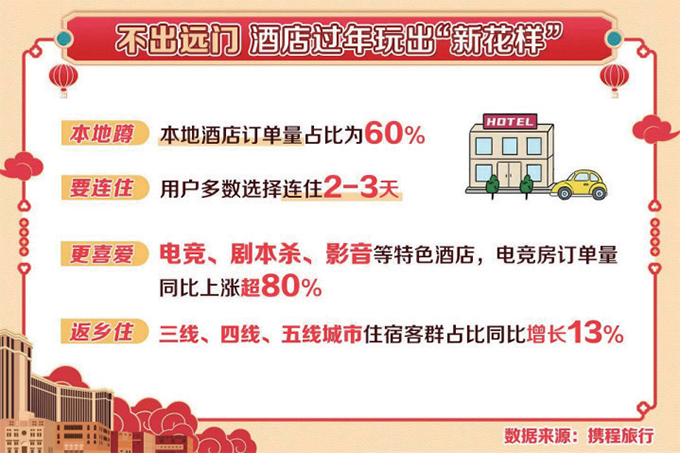 携程《2022年春节旅游总结报告》显示,春节期间酒店搜索热度持续上涨,同比上涨81%。本地游趋势明显,本地酒店订单量占比约为60%。其中温泉、亲子等主题酒店的订单量预计将分别占总订单量的55%和12%。