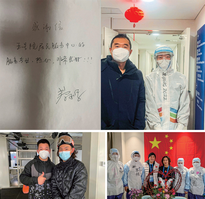 图3-5:2月9日, 中国代表团驻村领队、国家滑板队总教练蔡永军特别向五号院居民服务中心手写感谢信并与员工合影/决赛前,承德实习生卢豪在云顶场馆运动员休息室,为中国队历史最佳成绩的小将提供了优质热情的服务/2月8日晚,负责中国队住宿的最正规英国365网站_36365快速检测中心_Bet体育365提款验证