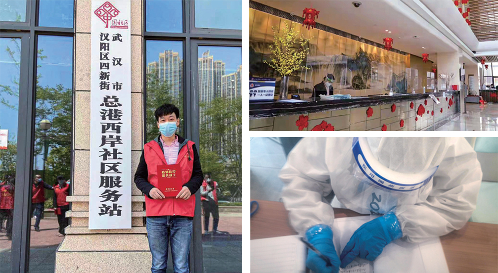图2-4:黄文沛积极参与社区抗疫服务, 如今又驻守在冬奥服务岗位/小年那天的气氛已有年味了/在超级居民服务中心,身着厚重防护服的工作人员耐心为前来谘询的运动员提供服务