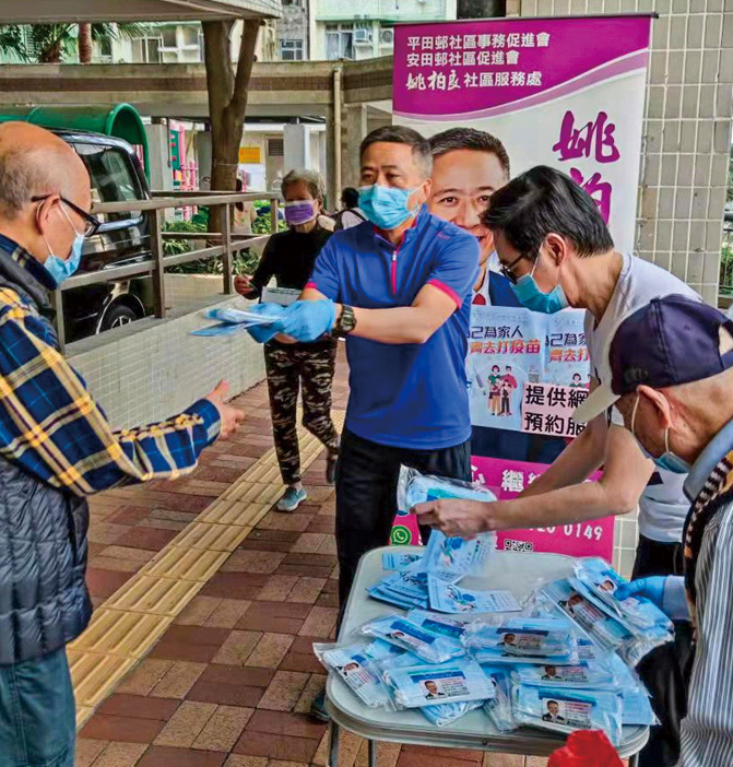 在疫情严峻的当下,他始终坚守社区,带领义工在抗疫物资极度匮乏的情况下,四处张罗药品、快速检测剂等,尽心尽力支援确诊的家庭、协助市民解决困难。他还向守护香港家园的前线警务人员捐赠了一批批抗疫紧急物资,亦转赠中央援港物资给前线保安及清洁人员,助力他们更好地守卫香港这个家。与此同时,他带领义工团队积极响应特区政府号召,包装特区政府「抗疫服务包」,并根据特区政府及地区团体统筹安排,率先为观塘区内无业主立案法团、无任何居民组织及无物业管理公司的「三无大厦」派发特区政府「抗疫服务包」,帮助政府更好掌握本港感染情况并向确诊者提供适切的治疗及支援,希望早日切断病毒在社区或家居的隐形传播链。