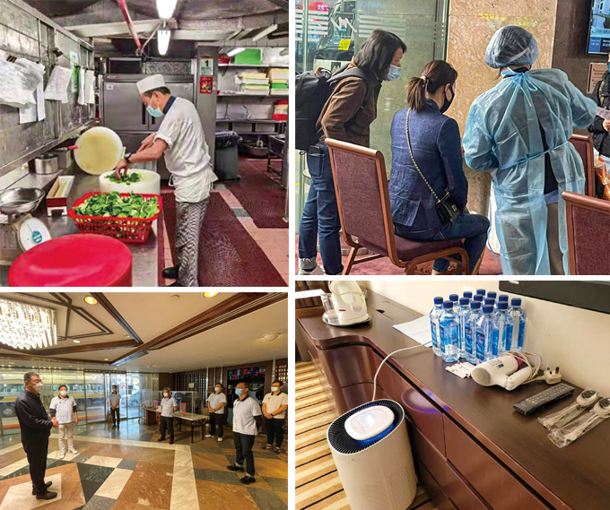 图1-4:餐厅精心设计每日餐食菜单/提供专业服务/集团石善博副总经理到九龙维景酒店检查指导该酒店的各项安排/在每层楼安放空气过滤机